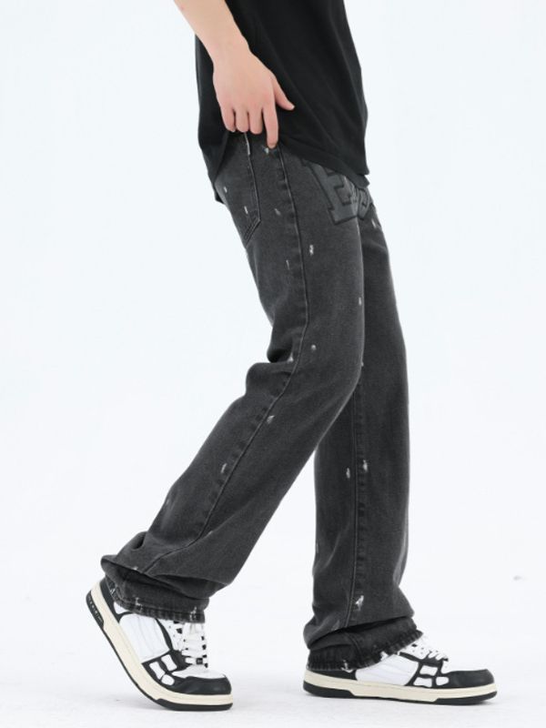 American Retro High Street Loose Straight Mop Leather Splash-ink Jeans