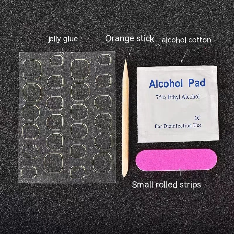 Jelly glue * 1 Orange wood stick * 1 Alcohol cotton * 1 Small Rubbing Bar * 1 Nail sticker * 1