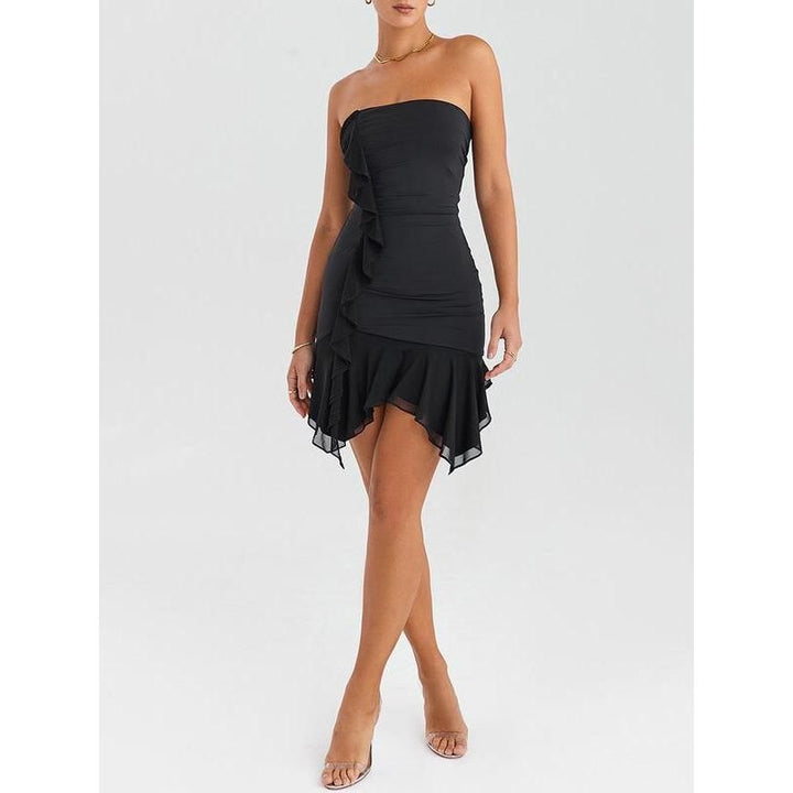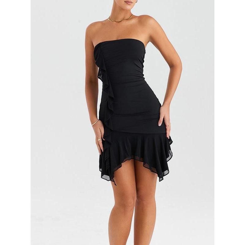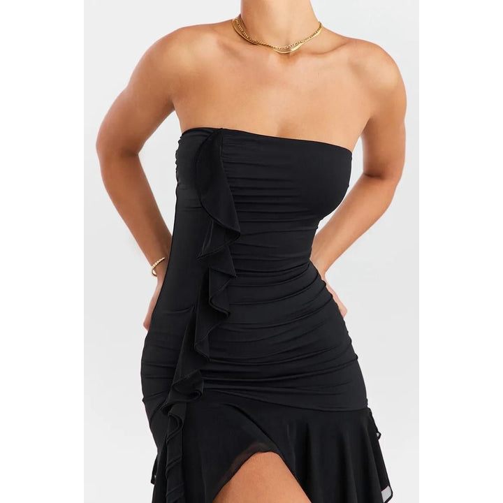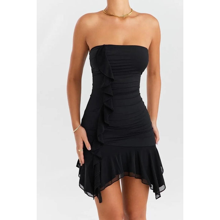 Introducing our Elegant Strapless Ruffles Mini Dress - a captivating blend of style and sophistication that's perfect for making a statement at club parties or special events. Crafted with precision from natural fibers, this dress is designed to enhance your curves and elevate your fashion game.