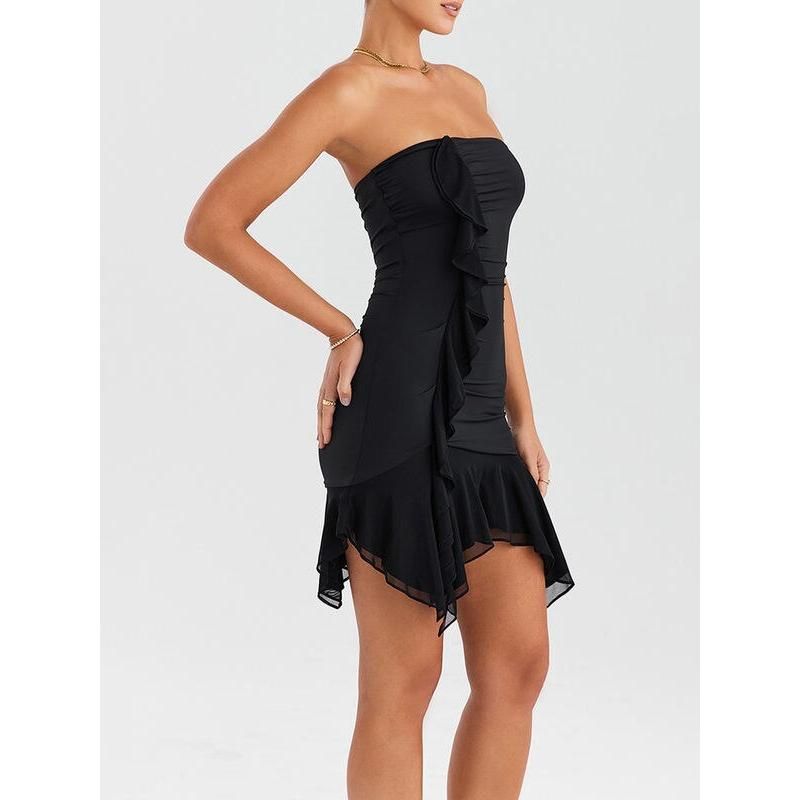 The Strapless Ruffles Mini Dress embraces your femininity with a bodycon fit that effortlessly accentuates your natural factors. The backless design adds a touch of allure, making it ideal for club parties or any special occasion.
