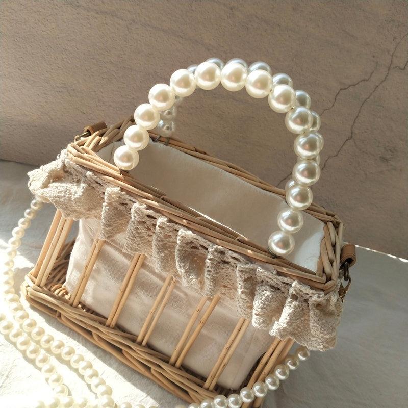 Handbag Chain Homemade Bag Pearl Woven Rattan Square Bag Straw Woven