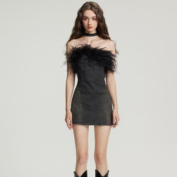 Experience the unique blend of comfort and style with this exquisite piece. Our mini dress boasts a flattering off-shoulder design, adorned with delicate feathers that add a touch of sophistication. The body-hugging silhouette, crafted from high-quality synthetic fibers, is complemented by a tasteful denim fabric. Its empire waistline and strapless neckline enhance your figure, ensuring a look that's both chic and elegant.