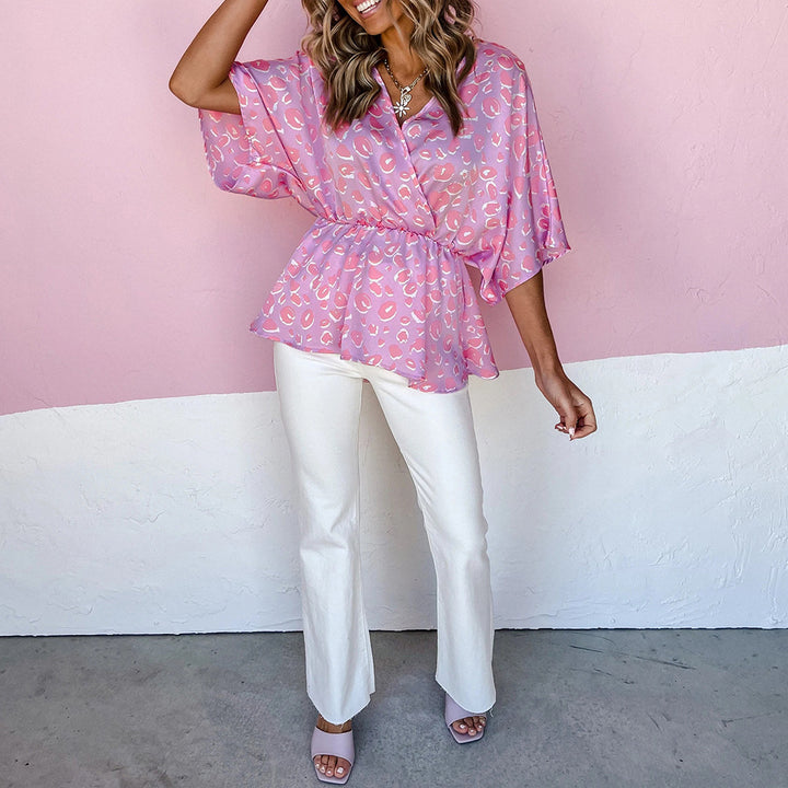 Women's Printed Batwing Sleeve Waist Trimming Casual Top